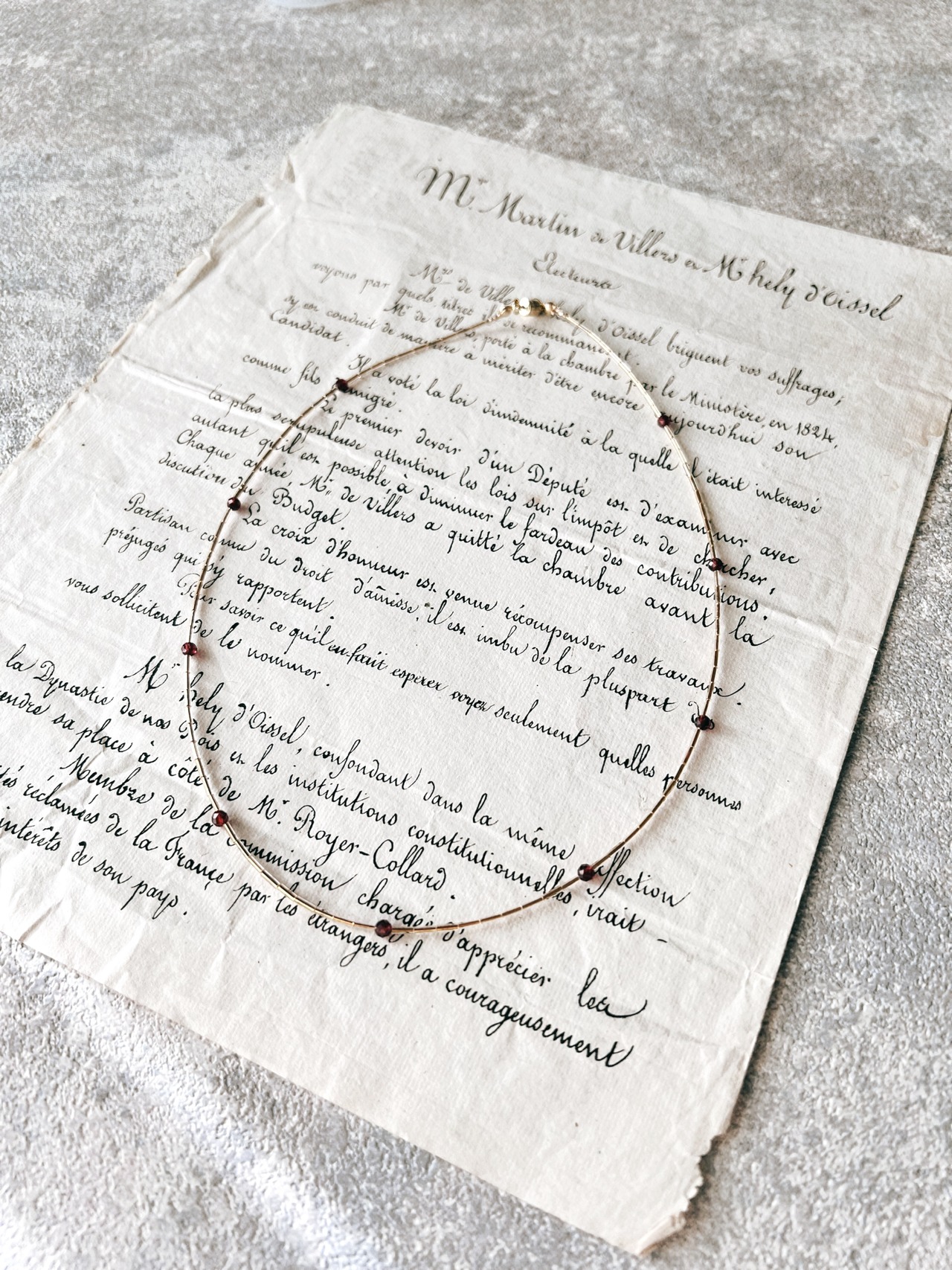 フランスビーズとガーネットをクロスしたチョーカーです。